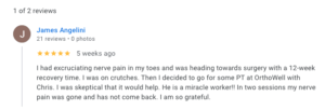 I had excruciating nerve pain in my toes and was heading towards surgery with a 12-week recovery time. I was on crutches. Then I decided to go for some PT at OrthoWell with Chris. I was skeptical that it would help. He is a miracle worker!! In two sessions my nerve pain was gone and has not come back. I am so grateful.