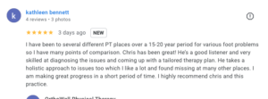 I have been to several different PT places over a 15-20 year period for various foot problems so I have many points of comparison. Chris has been great! He’s a good listener and very skilled at diagnosing the issues and coming up with a tailored therapy plan. He takes a holistic approach to issues too which I like a lot and found missing at many other places. I am making great progress in a short period of time. I highly recommend chris and this practice.