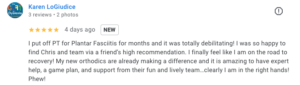 I put off PT for Plantar Fasciitis for months and it was totally debilitating! I was so happy to find Chris and team via a friend’s high recommendation. I finally feel like I am on the road to recovery! My new orthodics are already making a difference and it is amazing to have expert help, a game plan, and support from their fun and lively team…clearly I am in the right hands! Phew!