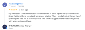 I highly recommend Chris and OrthoWell to all in need………P.S. the music playlists are great too!” 3/20/21