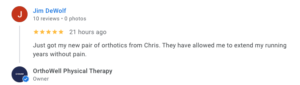 "I highly recommend OrthoWell. My foot was in such pain and within a few sessions I was feeling so much better. Chris made the best shoe inserts I ever had. Everyone who works here is patient and understanding. Great place!" 5/28/20