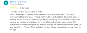 Well in Newburyport. Several years ago I had my first program with Chris. I was overwhelmed that time since I felt so much better in a short time. So when it came to needing PT again I had no other thought except Ortho. My sessions were prompt, hard working but not ever too hard and the result after each session was positive. The atmosphere in the office is pleasant and can even be fun. I not only give them 5 stars, I give them 10+++. Thanks Chris and staff. I’m sure I’ll see you again so you can fight my old age.